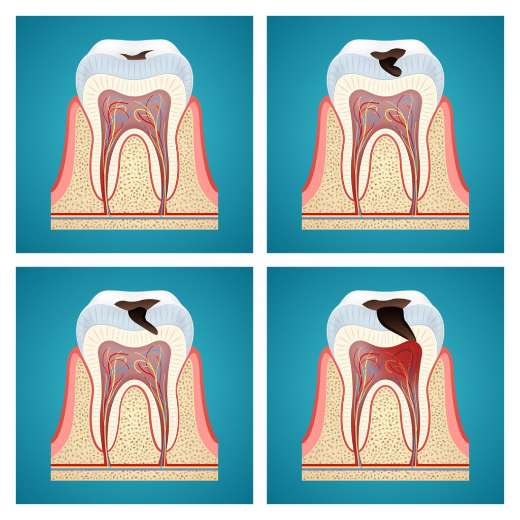 Ces bactéries transforment les sucres en acides qui attaquent la dent en formant un trou à sa surface : c’est la carie dentaire. Sans traitement, le trou s’agrandit et la carie devient plus profonde selon le schéma suivant de progression en 4 étapes:
