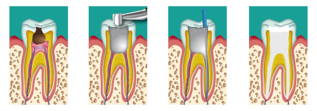 Sous anesthésie locale de la dent, le Chirurgien-Dentiste va creuser la dent pour atteindre les canaux jusqu’aux racines et extraire les nerfs atteints et tissus infectés ou nécrosés et procéder à un nettoyage et un soin anti bactérien.